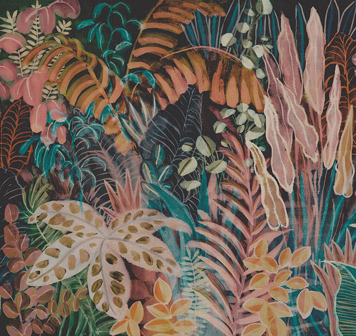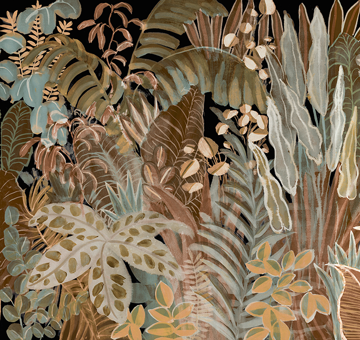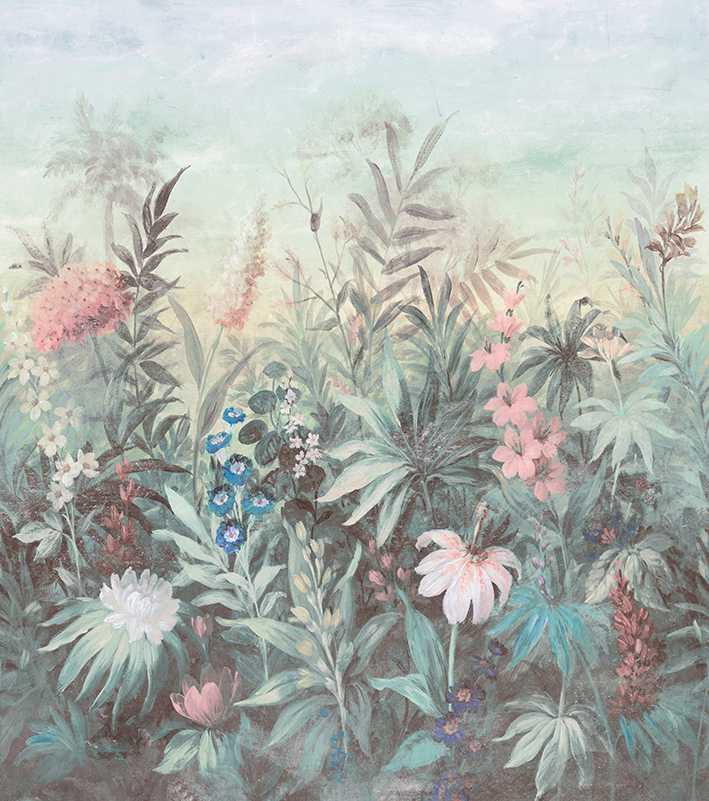 Unter Palmen: Mit dem Wandbild JUNGLE hält die Urlaubsfreude das ganze Jahr an. Zum Glück hat das 3,00 m x 3,18 m große Gemälde eine Menge tropischer Pflanzen und Gewächse im Gepäck. Die Farbpalette in diesem botanischen Paradies ist frisch, aber angenehm leise. Entspannung gehört schließlich zum Urlaub dazu.